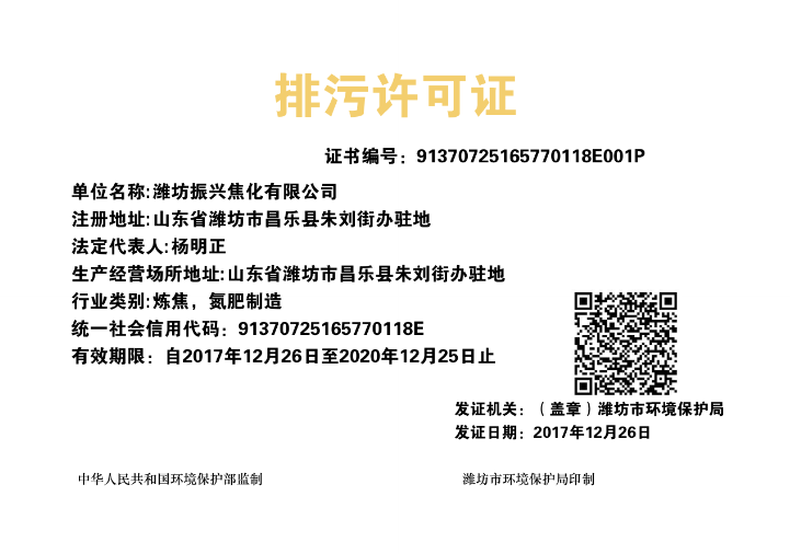 經過近一個月的共同努力,振興焦化公司終于如期完成了環保排污許可證的辦理工作,12月26日,環保排污許可證順利發放,