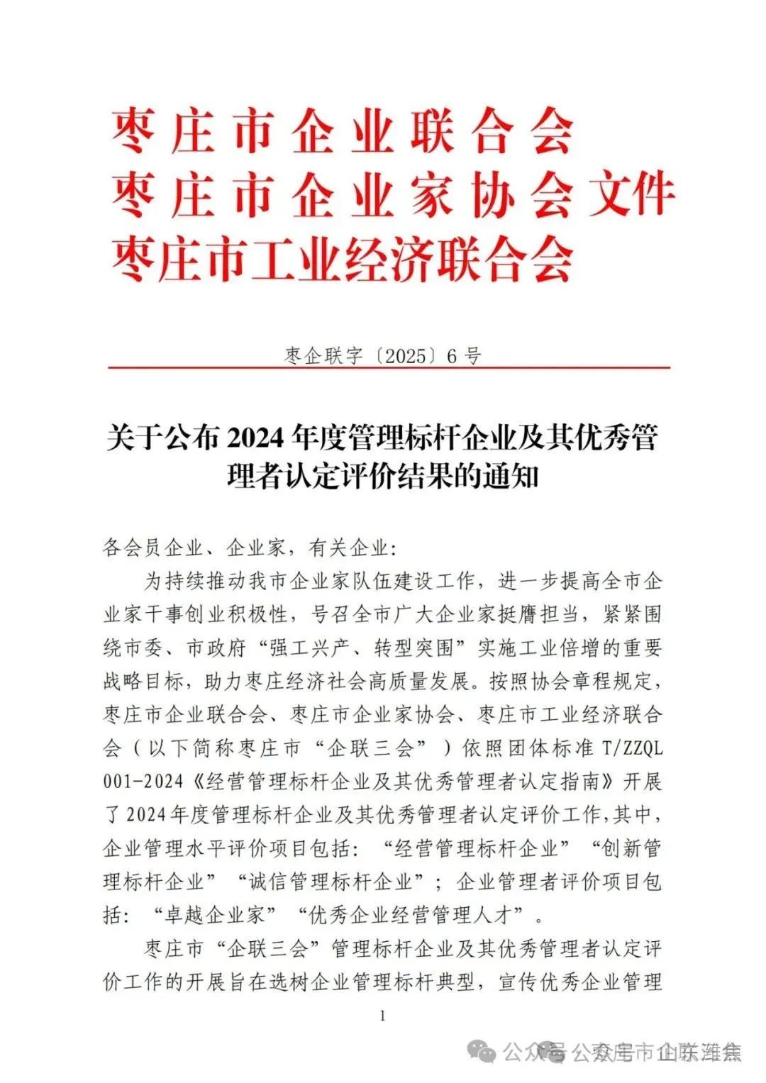 近日,棗莊市企業聯合會、棗莊市企業家協會、棗莊市工業聯合會發布《關于2024年管理標桿企業及其優 秀管理者認定評價結果的通知》,山東濰焦集團薛城能源有限公司、棗莊杰富意振興化工有限公司榮獲2024年度“經營管理標桿企業”稱號。這是對兩公司經營管理水平、管理創新能力等方面的充分肯定和認可。